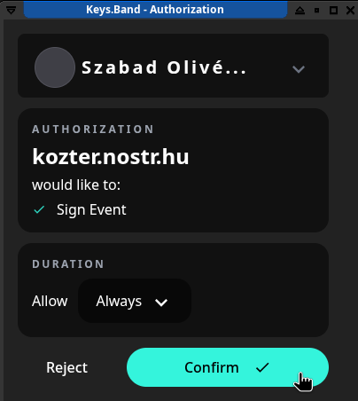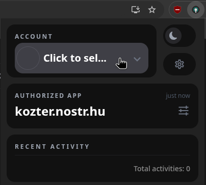 Innentől kezdve ha be akarunk lépni Nostr-rel egy weboldalra, pl. a Köztérre, a következő ablakot fogja feldobni a bővítmény:
